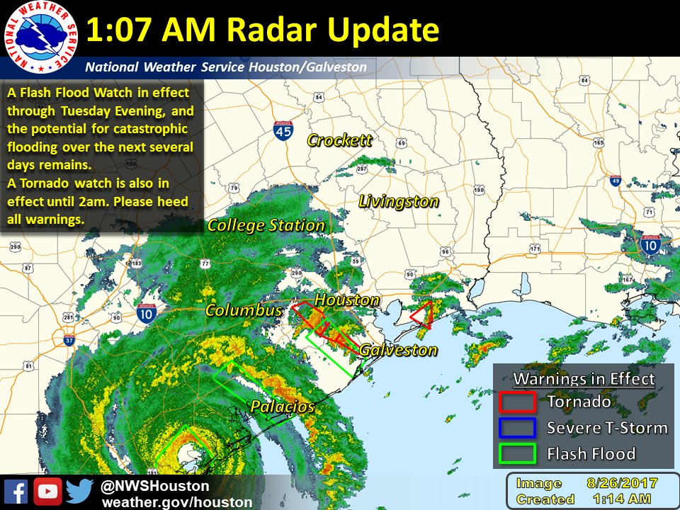 A tornado warning has been issued for southeastern harris county and portions of chambers county, including anahuac and monroe city, until 7:15 p.m. A flash flood warning was also issued for wharton. The original tornado warning for fort and harris counties will last until 3:15 p.m. This page currently has the past 48 hours of tornado warnings. If it's overnight, use the red cross tornado app set it to tornado warning and don't put your phone on silent.